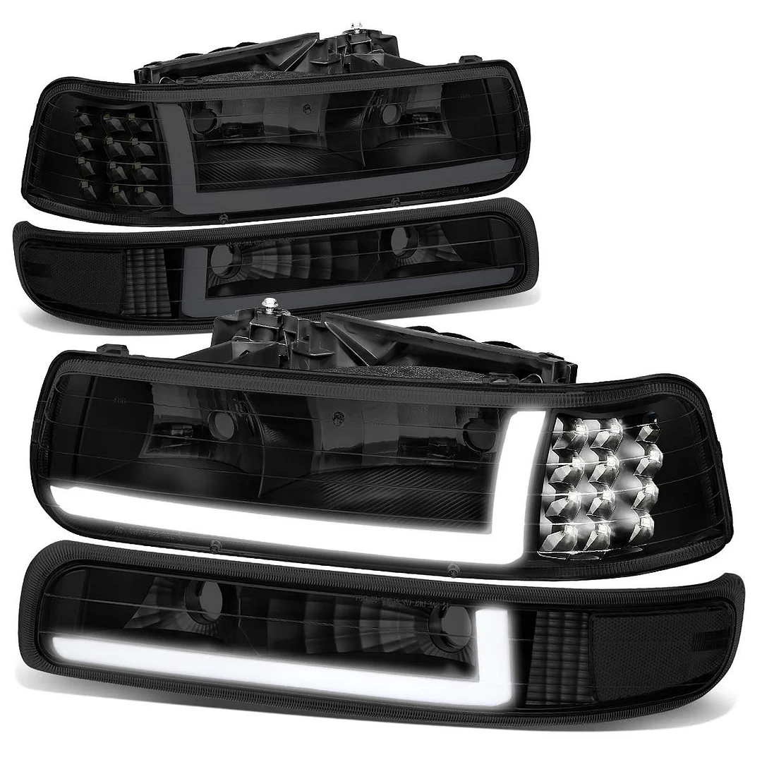 Auto Dynasty 4PCS LED DRL Headlights Assembly and Bumper Lamps Compatible with Chevy Silverado Suburban 1500 2500 3500 Tahoe 99-06, Driver and Passenger Side, Smoked Lens Clear Corner