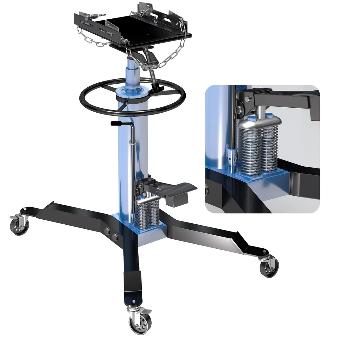 [Durable Construction]: Transmission Jack constructed of heavy-duty steel with a corrosion-resistant finish for long-lasting performance. The wide base of the transmission jack provides perfect stability, and the lifting pallets has two fixed chains to secure loads firmly.