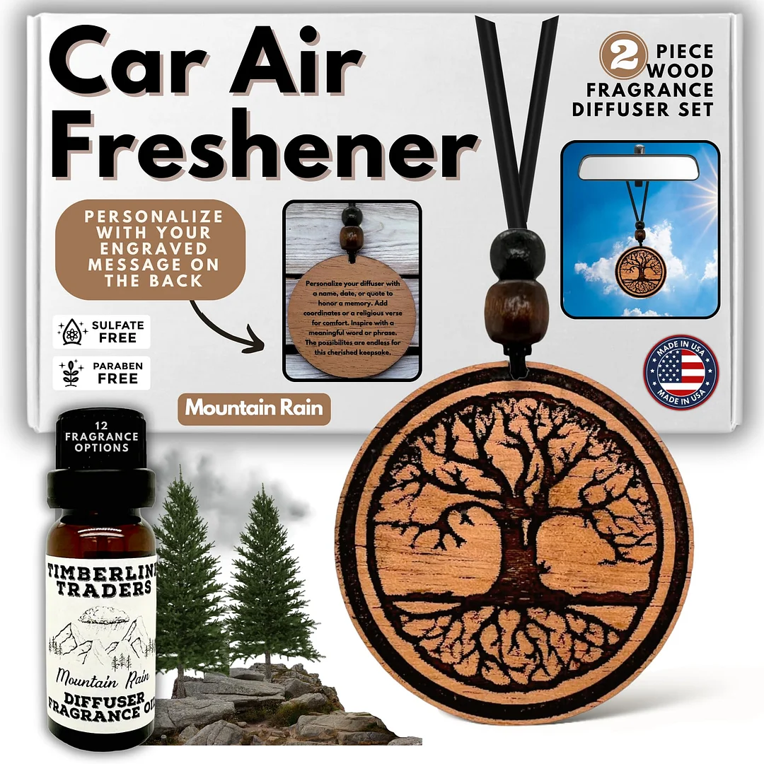 Personalized Car Air Freshener, Wood Diffuser and Fragrance Oil Set, Custom Message, Rearview Mirror Charm, Tree, Auto Accessory for Men or Women (Mountain Rain)
