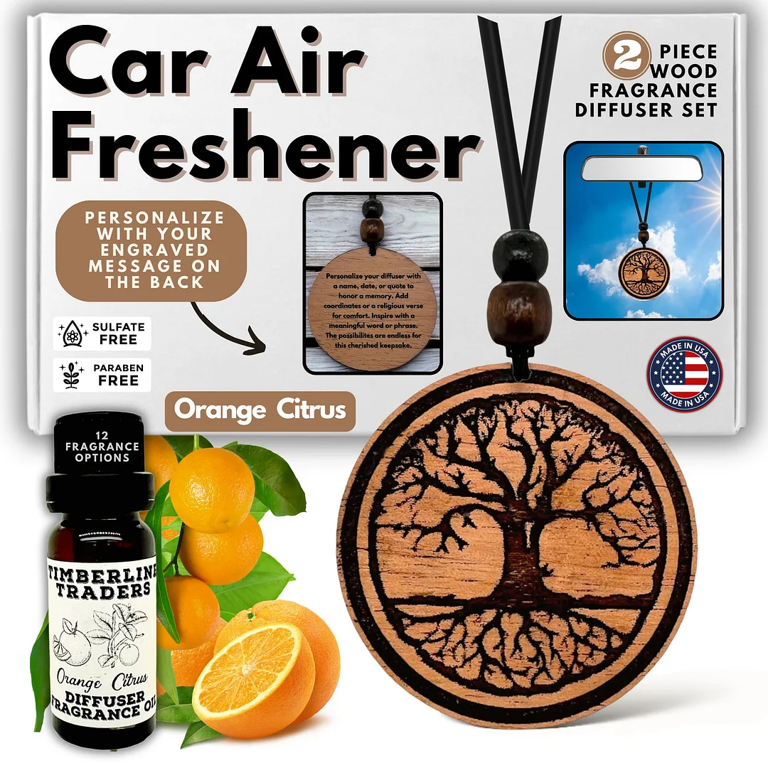Personalized Car Air Freshener, Wood Diffuser and Fragrance Oil Set, Custom Message, Rearview Mirror Charm, Tree, Auto Accessory for Men or Women (Orange Citrus)