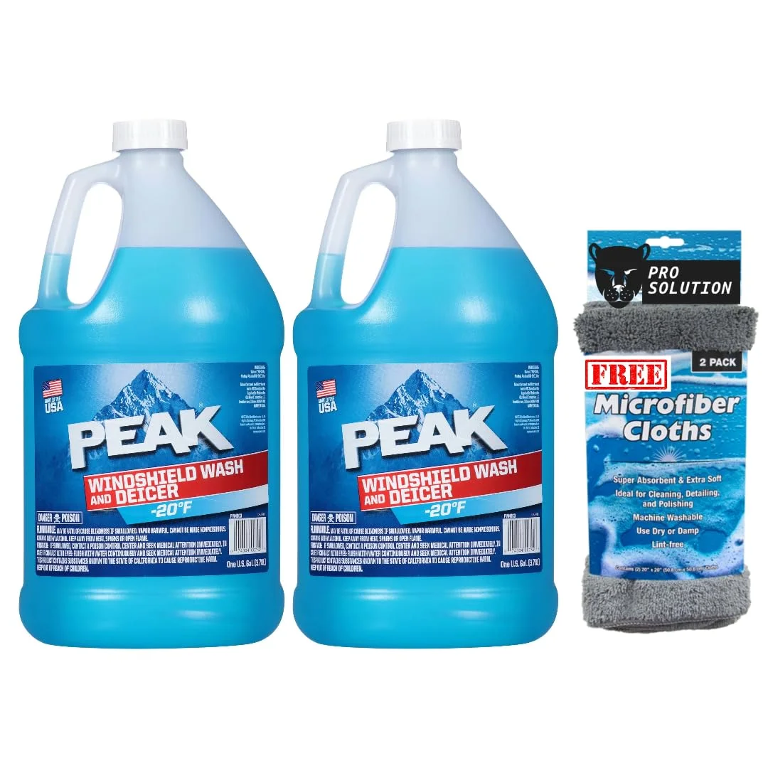 Windshield Wiper Washer Fluid Peak- 2 Gallons of Deicer Windshield Wiper Fluid with 2 Microfiber Cloths - (-20°F)